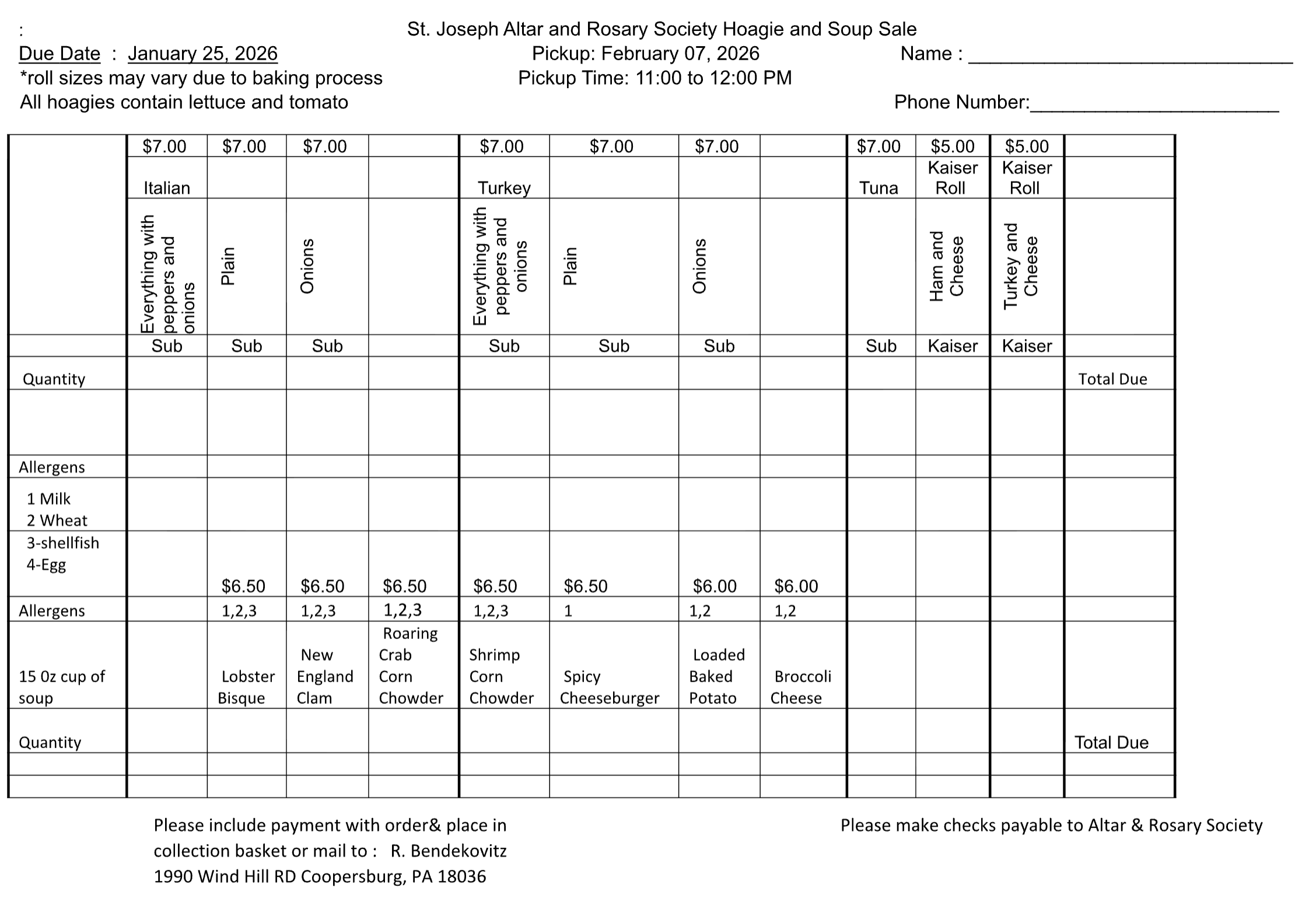 The Altar and Rosary Society will be holding their first hoagie sale of 2026 on the weekend of the Super Bowl by having a Soup and Sandwich Sale. The sale begins on Jan. 3 with orders being due on Jan. 25. Pick up is Saturday, Feb. 7, from 11AM-12PM in the parish center. You can find an order form below.