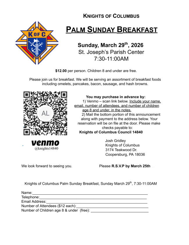 - 3/29 - KOC Palm Sunday Breakfast - More info below