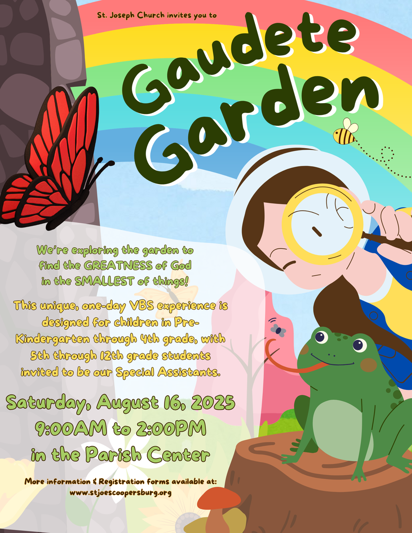 If you have any questions or concerns regarding VBS, please contact Janessa O’Donnell at the Rectory at 610-965-2877, or janessa.odonnell@stjoescoopersburg.org. We look forward to exploring Gaudete Garden with you at VBS 2025!