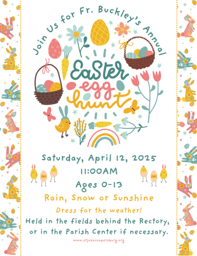 JOIN US! Peter Cottontail will once again be gracing our fields with hundreds of eggs for Fr. Buckley's Annual Egg Hunt! All parishioners ages 0-13 are encouraged to attend! Bring your basket & meet us on Saturday, April 12th. The egg hunt will begin at 11:00AM (and probably be over by 11:15AM!). Hunt is held rain, snow or sunshine - so dress for the weather! Boots & coats always encouraged. See you there!